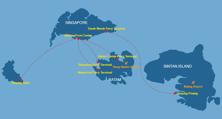 <table width='100%'><tr><td style='background:#ffdd00;color:#034b86;font-weight:bold;'>Tanjung Balai</td></tr><tr><td style='border-bottom:1px dashed #000;'>Harbourfront to Tanjung Balai</td></tr><tr><td style='color:red;font-size:11px;'>Travel Time Approximately 1 hour 30mins.</td></tr></table> <table width='100%'><tr><td style='background:#ffdd00;color:#034b86;font-weight:bold;'>Waterfront</td></tr><tr><td style='border-bottom:1px dashed #000;'>Harbourfront to Waterfront Ferry Terminal</td></tr><tr><td style='color:red;font-size:11px;'>Travel Time Approximately 50mins.</td></tr></table> <table width='100%'><tr><td style='background:#ffdd00;color:#034b86;font-weight:bold;'>Sekupang</td></tr><tr><td style='border-bottom:1px dashed #000;'>Harbourfront to Sekupang</td></tr><tr><td style='color:red;font-size:11px;'>Travel Time Approximately 45mins.</td></tr></table> <table width='100%'><tr><td style='background:#ffdd00;color:#034b86;font-weight:bold;'>Batam Center</td></tr><tr><td style='border-bottom:1px dashed #000;'>Harbourfront to Batam Center</td></tr><tr><td style='color:red;font-size:11px;'>Travel Time Approximately 55mins.</td></tr></table> <table width='100%'><tr><td style='background:#ffdd00;color:#034b86;font-weight:bold;'>Tanjung Pinang</td></tr><tr><td style='border-bottom:1px dashed #000;'>Tanah Merah Ferry Terminal to Tanjung Pinang</td></tr><tr><td style='color:red;font-size:11px;'>Travel Time Approximately 1 hour 50mins.</td></tr></table>